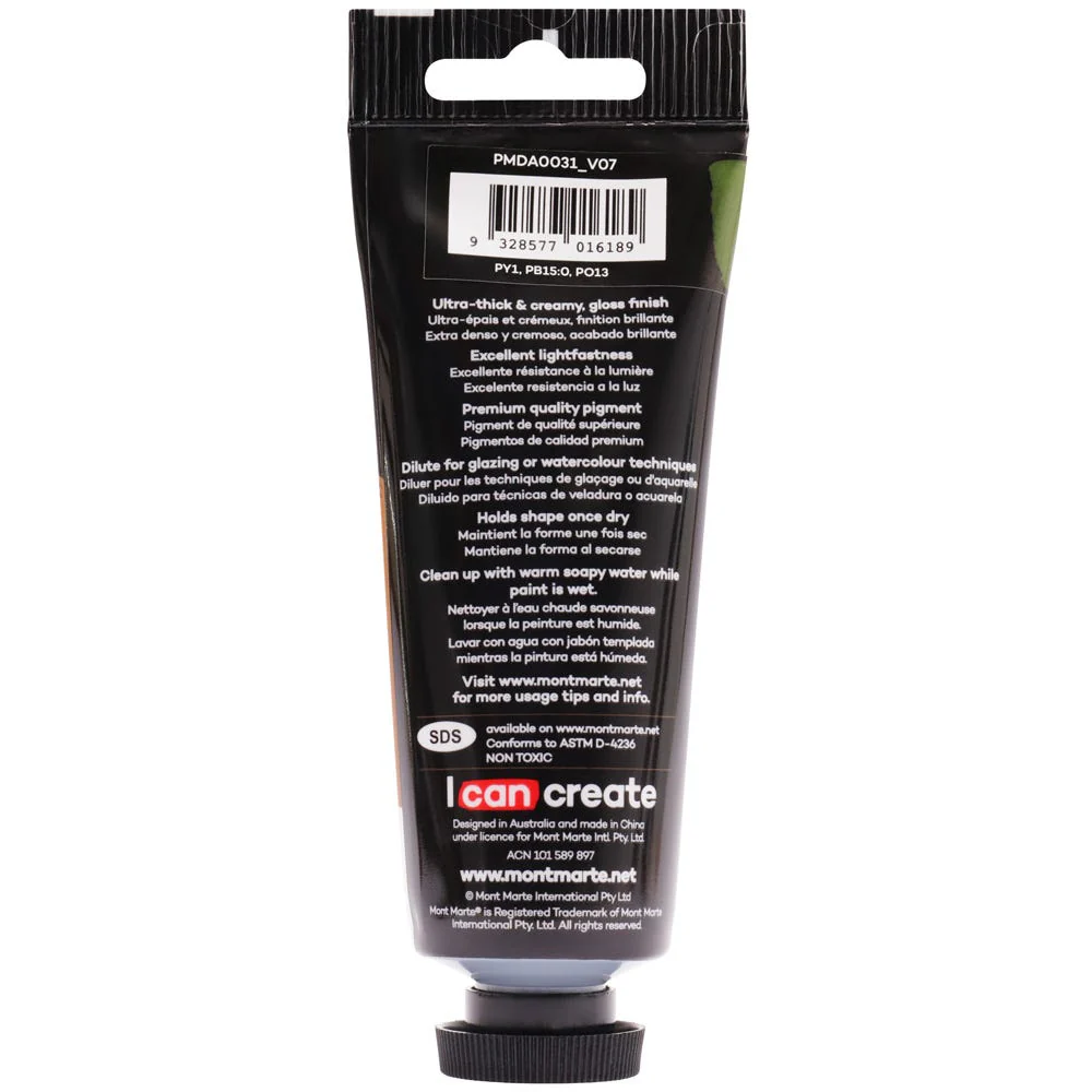 Mont Marte Premium Dimension Acrylic is a high viscosity fine art paint that offers artists a new dimension in painting. This acrylic's ultra thick consistency can be applied with brush, palette knife or shaper to create especially exaggerated texture effects. Dries hard and holds shape while still maintaining flexibility and smooth flow-ability. It can be diluted with water or acrylic mediums for glazing or watercolour techniques. With dilution, the pigment still holds strong colour intensity. Excellent lightfastness and premium quality pigment means colour strength will stay brilliant for longer. The series is available in a range of vivid colours which dry to a radiant gloss finish