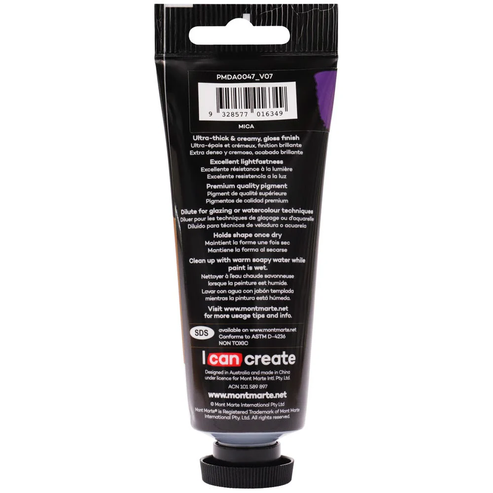 Mont Marte Premium Dimension Acrylic is a high viscosity fine art paint that offers artists a new dimension in painting. This acrylic's ultra thick consistency can be applied with brush, palette knife or shaper to create especially exaggerated texture effects. Dries hard and holds shape while still maintaining flexibility and smooth flow-ability. It can be diluted with water or acrylic mediums for glazing or watercolour techniques. With dilution, the pigment still holds strong colour intensity. Excellent lightfastness and premium quality pigment means colour strength will stay brilliant for longer. The series is available in a range of vivid colours which dry to a radiant gloss finish