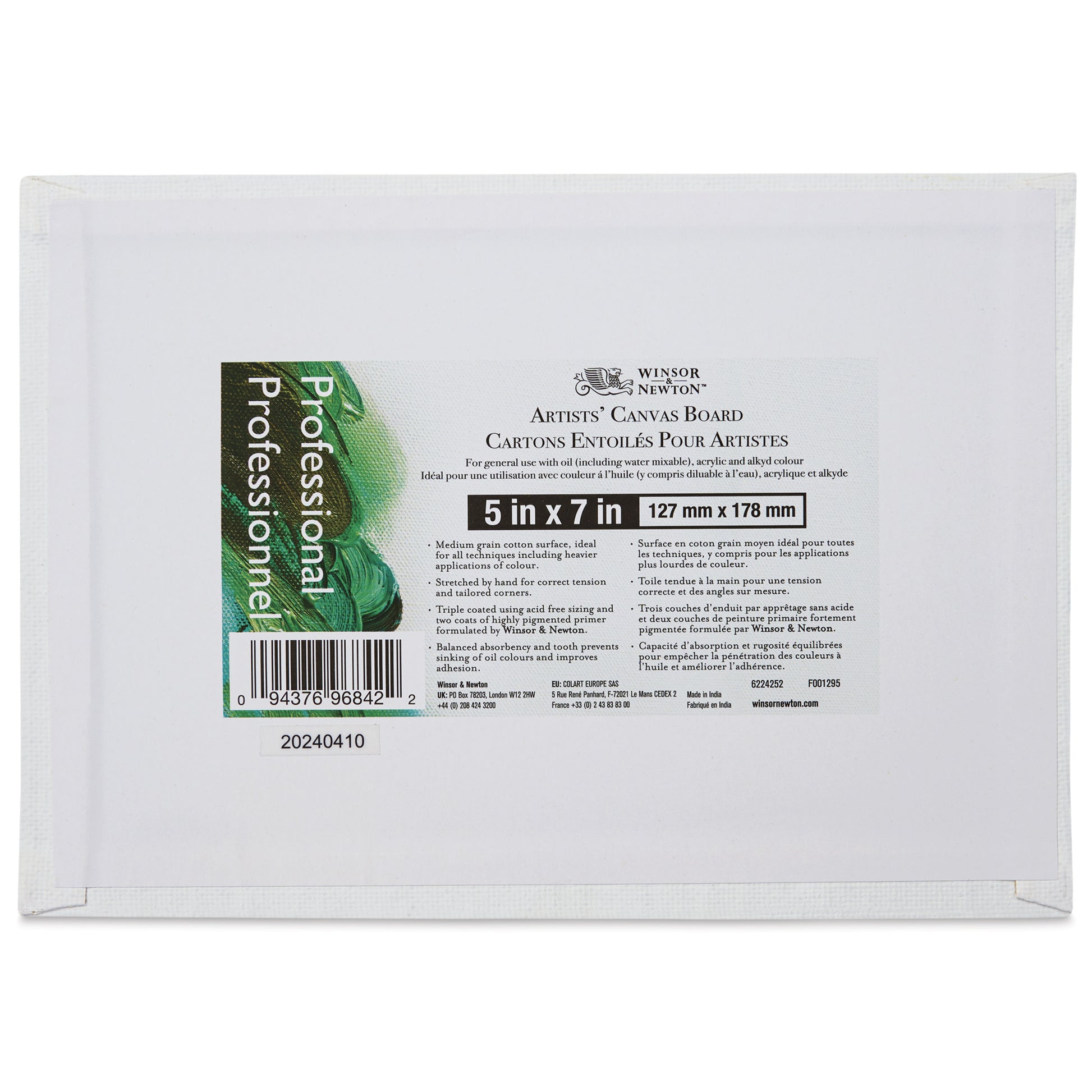 Artists' Canvas Board is correctly prepared for immediate use by the artist and are suitable for use with Oil, Water Mixable Oil, Alkyd and Acrylic colours. The medium grain surface is ideal for all techniques including heavier applications of colour. The balanced absorbency and tooth of the canvas board prevents sinking of